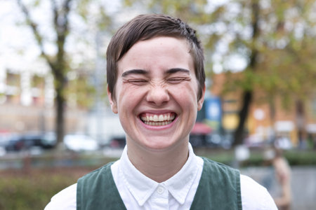 Portrait of a young man laughing in the street. Outdoors.