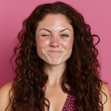 Winking woman with freckles and curly auburn hair.