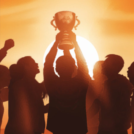 A diverse group of teammates holds a championship cup aloft, silhouetted against a glowing orange sky. The image captures emotional unity and success in a side profile composition.
