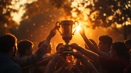 A diverse group of teammates holds a championship cup aloft, silhouetted against a glowing orange sky. The image captures emotional unity and success in a side profile composition.