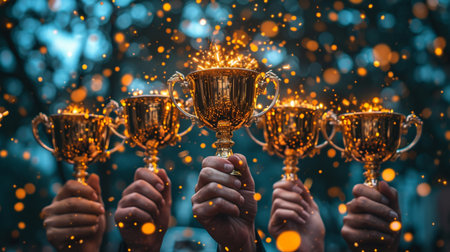 Multiple hands collectively lifting a golden trophy during sunset, symbolizing unified victory and teamwork in an outdoor setting with warm, celebratory ambiance.