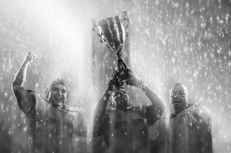 Crowd of people raising golden trophy against dark background with falling confetti. Team celebrating winning game