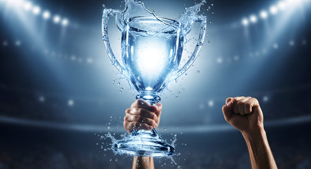 A pair of hands triumphantly raises a trophy made entirely of splashing clear water, with a bright light glowing from within. The background is a blurred stadium with bright lights, conveying concepts of victory, success, and pure achievement.
