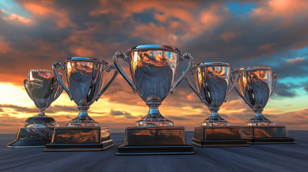A stunning collection of gleaming trophies lined up against a vibrant sunset, symbolizing victory and achievement in competitions and events.