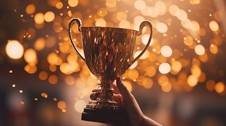 Close-up of female hand holding golden trophy cup on bokeh background