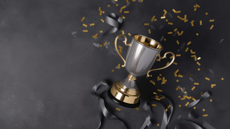 A golden trophy cup with confetti on table and glowing bokeh lights background, symbolizing achievement and celebration