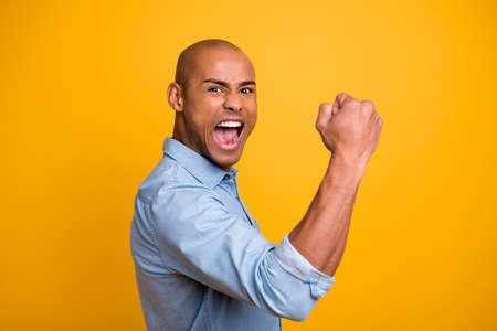 Profile photo of dark skin guy raise hands yell loud success achieve startup wear jeans denim shirt isolated bright yellow background