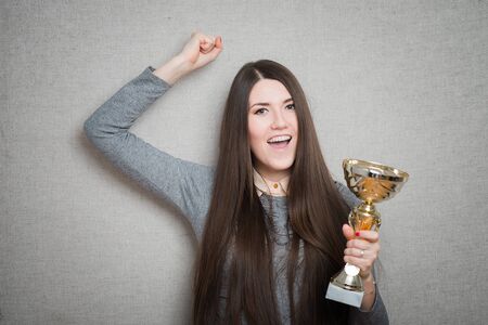 motivation of business success. trophy and prestige. got prize. guy celebrate victory.