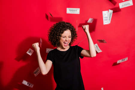 Photo of curly hairstyle girl scream closed eyes open mouth yes won black t-shirt isolated on red color background