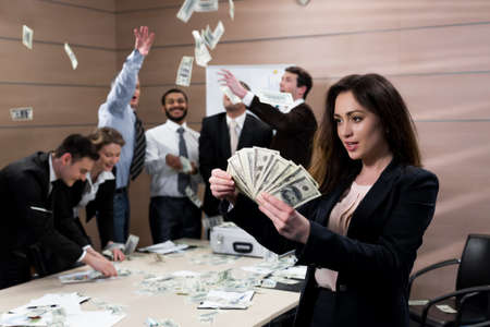 Portrait of cheerful business team of multi-ethnic employees celebrating victory and big profit at office workplace. Cheerful excited young business man and woman throwing away banknote. Rain of money