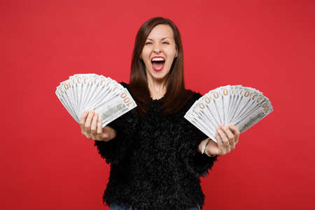 Overjoyed young woman in black fur sweater screaming, holding fan of money in dollar banknotes, cash money isolated on red background. People sincere emotions, lifestyle concept. Mock up copy space