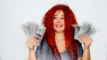 A rich red-haired woman holds a wad of dollars in her hand. Concept of financial success