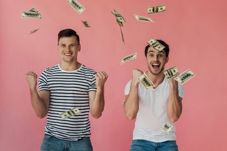 front view of two excited friends with dollar banknotes showing yes gestures isolated on pink