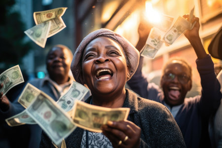 A joyful man raises his arms as money falls from the sky, symbolizing financial success and abundance. on a light background