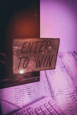 Writing note showing Enter To Win. Business concept for exchanging something value for prize or chance of winning Notation paper computer monitor screen near white keyboard