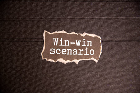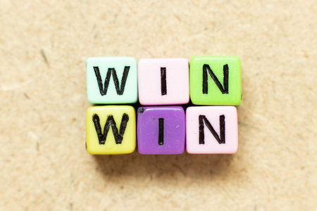 Hand arrange alphabets wood blocks into plus sign with text Win-Win on wood table background, business joint venture concept