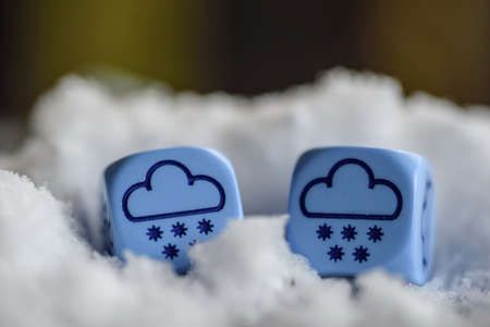 concept of winter weather, dice with clouds and snow lying on snow - stock photo