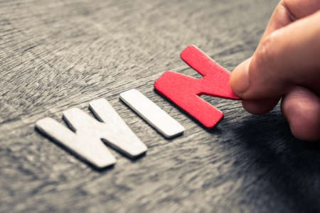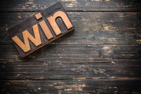 The word WIN written in vintage wood letterpress type on a vintage rustic background.