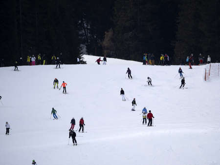 Young freestyle snowboarder running down the slope and ride free style at sunny winter day on Alpine mountains.