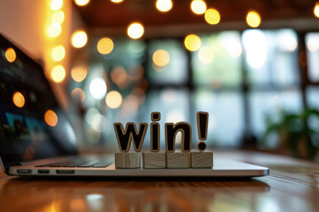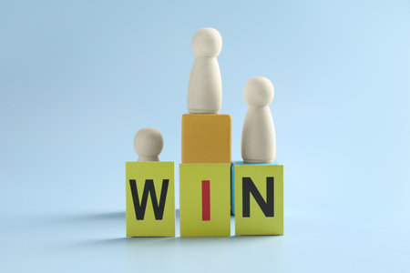 Cards with word Win, human figures on cubes, wooden one on top against light blue background