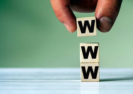 The hand puts the cube block with the inscription WWW. WWW concept.
