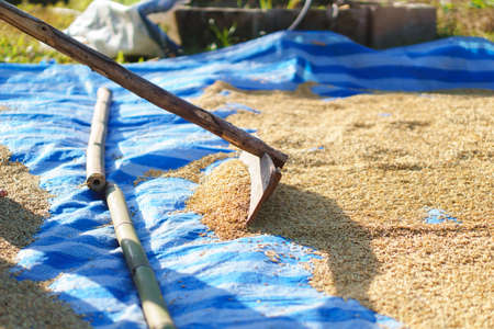 Paddy rice dried by sun light using wooden board pole before use as seed for new season