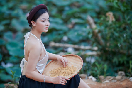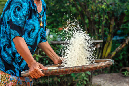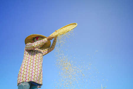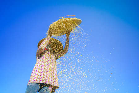 Beautiful Thai Asian women winnow rice separate between rice and rice chaff identity