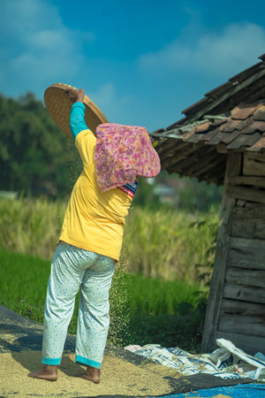 16 July 2023, Trawas, Mojokerto, East Java, Indonesia. A lady working on sieving paddy grains in traditional way under direct sunlight.