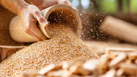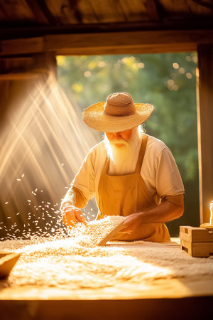 A close-up view captures a hand skillfully sifting grain amidst natural light, emphasizing the grains' texture and the rustic charm of traditional farming practices.