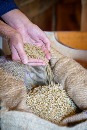 Close-up view of hands gently holding wheat grains from burlap sacks in a rustic setting, showcasing the essence of agriculture and harvesting practices.