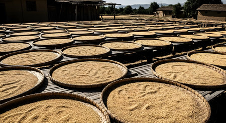 A close-up of rice grains drying under the sun, spread out on a traditional mat, showcasing the process of preparing the harvest for storage and consumption