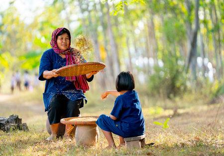 Rural life style concept. An Asian girl helps his mother to work after returning from school. Grain separation.
