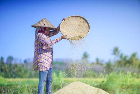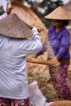 Ubud, Bali island, Indonesia - March 25, 2017: Indonesian farmer woman harvesting, winnowing rice grains in terraced rice field. Traditional rice plantations, agriculture in Balinese villages.