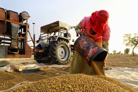 Wheat harvest in village on field. Farmers manually clean the harvested grain. Rural agriculture background.