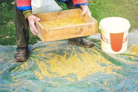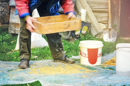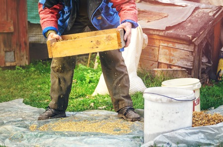 The farmer sifts the grain manually. Hands of the worker who sifts the grain of oats through a sieve. Hands of an elderly person. Disappearing profession concept