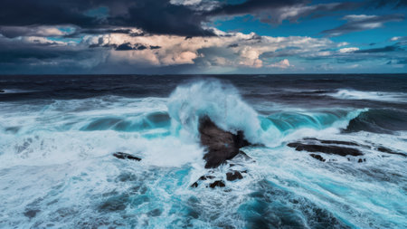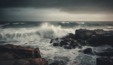 Powerful ocean waves crash against rugged rocks under an ominous sky, capturing the raw beauty and intensity of nature. A stunning coastal landscape at dusk.