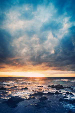Beautiful colorful sunset at the sea with dramatic clouds and sun shining. Beauty world natural outdoors travel background