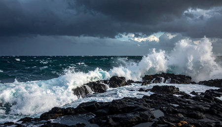 A breathtaking view of powerful ocean waves crashing against rugged rocks under a dark, stormy sky, capturing the essence of nature's wild beauty and force.