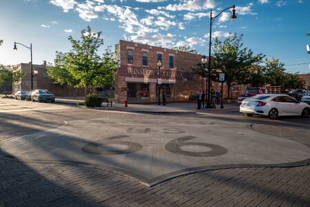 JULY 1 2018 - Winslow AZ: On Route 66, Standing on the Corner Park commemorates the song Take It Easy, written by Jackson Browne and Glenn Frey with The Eagles band, on a sunny summer day.