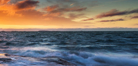 Baltic sea at sunset. Dramatic sky, glowing clouds, waves and water splashes. Epic seascape. Nature, environment, ecology, climate change. Panoramic view