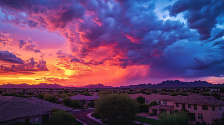 A breathtaking sunset illuminates a tranquil residential area with dramatic sky colors, featuring vibrant oranges, purples, and blues. Mountains silhouette the horizon in this picturesque landscape, capturing the beauty of nature.