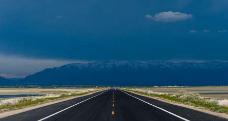 Straight road going towards a very stormy and black sky with the mountains on the horizon under heavy rain. Angtelope island, Utah, United States of America