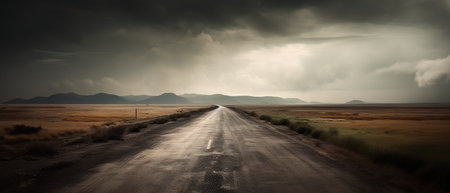 A long, cracked asphalt road with yellow and white lines leads towards a distant horizon under a dramatic sky filled with dark storm clouds and...