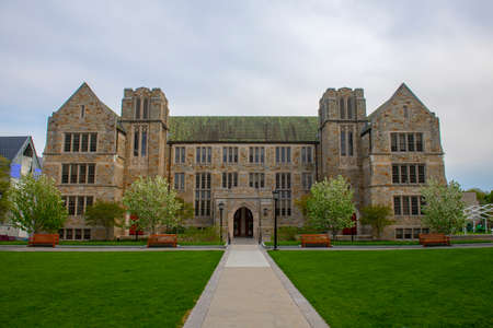 Fulton Hall with Collegiate Gothic style at the quad in Boston College. Boston College was established in 1863 in Chestnut Hill, Newton, Massachusetts MA, USA.