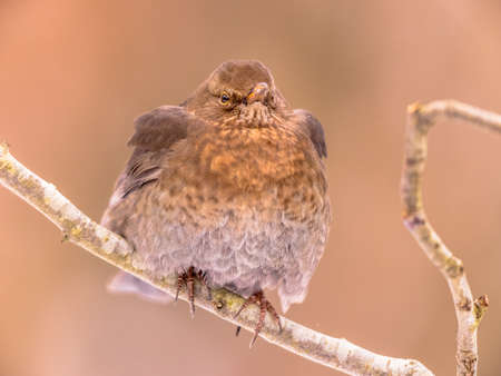 Female Common Blackbird (Turdus merula) Eurasian Black Bird perched on branch in cold weather. In garden in Winter conditions. The Netherlands.
