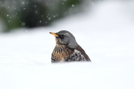 Fieldfare, Turdus pilaris, single bird in snow, Warwickshire, January 2013