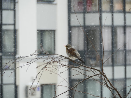 A fun gray and orange fieldfare Turdus pilaris sits on a gray branch with snow in the park in winter