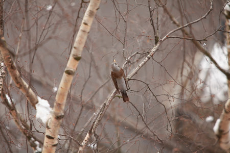 Turdus philomelos. Fieldfare bird sitting on a branch in winter.