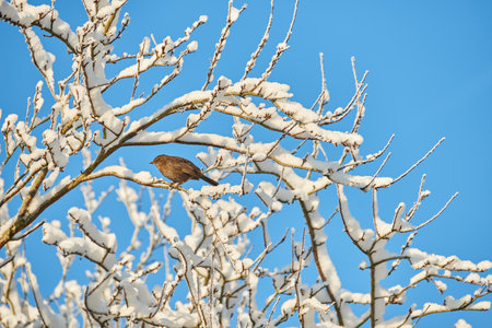 A bird is perched on a branch covered in snow. The bird is brown and white, and it is looking down. The image has a peaceful and serene mood, as the bird is enjoying the winter scenery