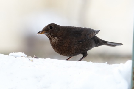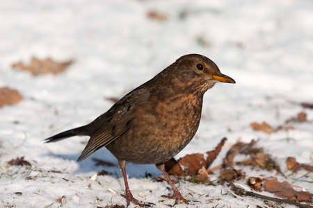 female of Common blackbird (Turdus merula) on in winter garden, on ground in snowy day, Czech wildlife